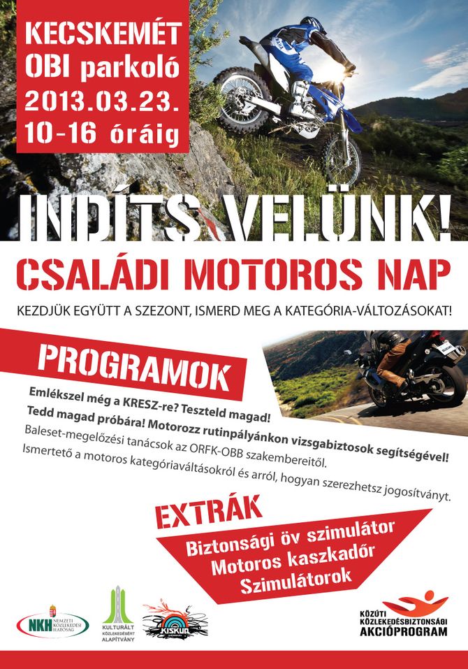 1. A családi motoros nap előkészítése során első körben a Kormányhivatal közlekedési felügyelősége a Bács-Kiskun megyei igazgatójával történt egy megbeszélésünk, melynek során Karsai Attila igazgató úr megígérte, hogy a mobil műszaki személygépjármű vizsga sort, 4 fő működtető kollégával a családi motoros napon az Obi parkolóban rendelkezésünkre bocsátja. Megígérte továbbá, hogy a tesztlapos kitöltéshez 2-3 fő vizsgabiztos kollégát, úgyszintén a motoros nap sikere érdekében rendelkezésünkre bocsátja. Ígéreteit betartotta, amit megköszöntem és ezúton is javaslom elismerni.