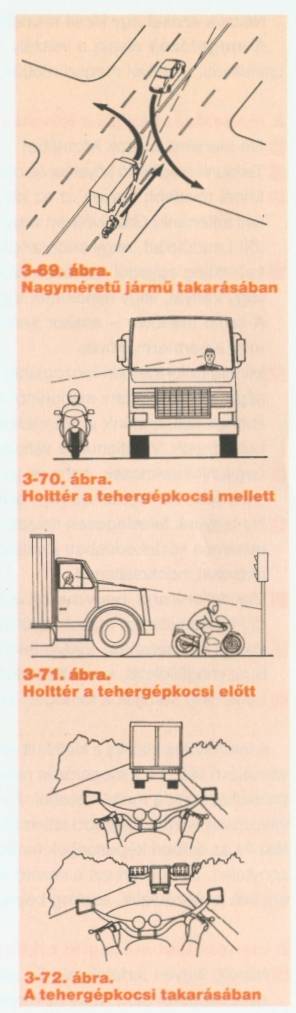 A tehergépkocsi közelében tartózkodás veszélyét növeli az a tény is, hogy a tehergépkocsi vezetője nem láthatja a közvetlenül mellette 13-70, ábra), valamint a közvetlenül előtte haladó motorost (3-71. abra). Ugyanakkor a tehergépkocsi takarásában közlekedő motoros szabad kilátása túlzottan korlátozott, emiatt értékes információkat veszít (3-72. ábra).