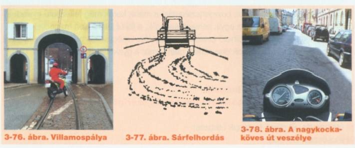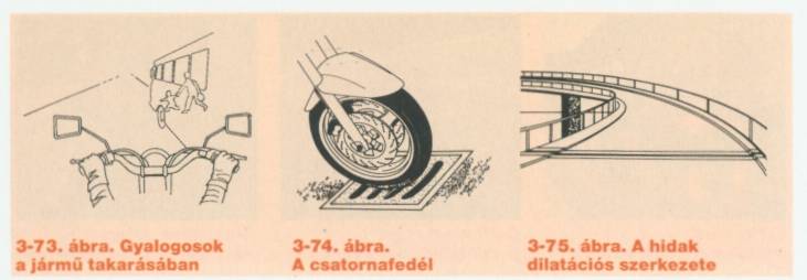 Hasonlóan csúszik és veszélyes nedves időben a csatornafedél is (3-74. ábra). A rajta megcsúszó motorkerékpárt megtartani, megfogni nagyon nehéz, szinte lehetetlen. A megoldás: időben kell lassítani, és kikerülni a veszélyes helyet.