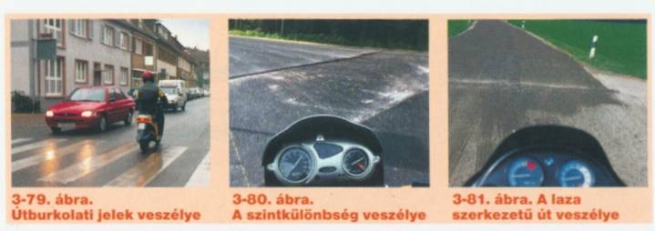 A régi nagykockaköves utak, útburkolati jelek különösen esős időben csúszósak, de az épülő utak burkolatának szintkülönbsége és laza szerkezete is balesetveszélyes (3-78. - 3-81. ábrák).