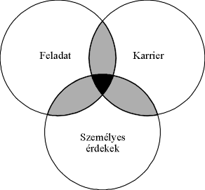 A fenti ábra azt a kapcsolatot és feszültséget illusztrálja, amely gyakran létrejön egy adott személy munkája (feladat), pályán való előrejutása (karrier) és a személyes értékei, életstílusa (személyes érdekei) között. A három részhalmaznak lehetnek közös részei (a satírozottak), de maradhatnak különállóak is. Egy adott szervezetben dolgozva megpróbáljuk az érdekek három halmazát egyensúlyban tartani. Leggyakrabban az egyensúly nem könnyű és állandóan változik, feszültségeket eredményez, amelyek a politikai tevékenység központjában fekszenek. Az a tény, hogy az érdekek teljes konvergenciájának területe (a legsötétebb rész, a közös rész) gyakran kicsi, az egyik oka annak, hogy a szervezeti racionalitás miért olyan ritka tünemény. A mindennapi életben az érdekekre leginkább térbelileg gondolunk; olyan területekre, amelyeket meg akarunk őrizni vagy növelni szeretnénk, olyan pozíciókra, amelyeket meg akarunk védeni vagy el akarunk érni. Érdekeink középpontjában élünk, másokat gyakran az érdekeink közé betolakodónak érzünk, készek vagyunk berendezkedni a pozíciónkat megtartó vagy növelő védelemre és támadásra. A politika folyama szoros kapcsolatban van a saját helyezkedésünk útjával. Sokféleképpen definiálhatjuk és elemezhetjük az érdekek érvényesítését és védelmét. Az egyik mód, amely különösen releváns a szervezeti politika megértésében, az, hogy az érdekeket a három kölcsönösen kapcsolatban álló halmaz függvényében értelmezzük, amelyek az egyén szervezeti feladatához, karrierjéhez és személyes életéhez kötődnek. (ld. 2. ábra). A feladat érdekei ahhoz a munkához kapcsolódnak, amit az illetőnek el kell végeznie. A termelési üzem vezetőjének biztosítania kell, hogy a termékeket időben és hatékony módon állítsák elő. A kereskedőnek el kell adni az áru megfelelő hányadát, és meg kell tartania a vevőkört. A könyvelőnek rendesen kell vezetnie a könyveket és napra kész számviteli információkat kell produkálnia, ha kell. Természetesen az életnek a munkával töltött része mindig többet jelent, mint éppen csak dolgozni. A munkavállalók magukkal hozzák a munkahelyükre törekvéseiket, jövőjüket illető elképzelésüket, ezzel szolgálják az alapot a karrier érdekeikhez, amelyek a végzett munkájuktól lehetnek akár függetlenek is. Magukkal hozzák egyúttal a személyiségüket, értékeiket, preferenciáikat, hitüket és az állásukon kívüli elkötelezettségeik halmazát is. Ezáltal teszik lehetővé azt, hogy ezek a személyes érdekek alakítsák ki azt a módot, ahogyan tevékenykednek mind a napi munkájukban, mind a karrierjüket illetően. A három érdekhalmaz közti kapcsolatokat jobban megismerhetjük, ha megvizsgálunk egy speciális helyzetet. Tekintsük például egy vállalati felső vezető helyzetét egy nagy szervezetben. Lehet nagyon elkötelezett a munkájában, ambiciózus, és a családi élethez is szorosan kötődő. A gyakorlati munkában vágyakozhat arra, hogy irányítsa mind a hármat: jó munkát végezzen, előre jusson a szervezetben, és elfogadható egyensúlyt tartson a munka és a szabadidő között, hogy a hétvégeket és a legtöbb estét a családjával tudja tölteni. Néhány esetben mindhárom egybeeshet, máskor az érdekeknek két szférája lehet kompatibilis; megint más esetekben a különböző érdekek nincsenek egymással kapcsolatban. Az ügyvezető élete simán folyik az első esetben (például: támadhat egy jó ötlete, mely növeli teljesítményét, hozzásegíti az előreléptetéshez, sőt még több szabadidőt is biztosít számára), de az utóbbi esetekben nehézségei vannak. Az ötlete növelheti a teljesítményét és a pályáján való előrehaladását, de több munkát és kevesebb szabadidőt hozhat. Vagy képessé teheti arra is, hogy csökkentse a munkában való leterheltségét, de oly módon, hogy kevésbé látványos, amit csinál, és így kevesebb esélye lesz az előléptetésre. Néha az ötlet nagyszerű lesz a munkájában, de egyáltalán nincs semmi egyéb jelentősége. A vezető viselkedése és a feladatokhoz való kapcsolódása, az elgondolt ötletei és kísérletei azoknak alkalmazására, és az a mód, ahogyan reagál mások javaslataira, valószínűleg alapvetően függnek attól, hogy a feladatok, az ötletek vagy a javaslatok a 2. ábra érdekeket ábrázoló melyik mezőjébe esnek. A különböző érdekek között létező feszültségek, amelyeket szeretne csökkenteni, a munkához való kapcsolatát következésképpen politikai kapcsolattá változtatják még akkor is, ha előtte tekintetbe vesszük a szervezet más tagjainak létét és cselekedeteit. A nyugati társadalmakban ezek a feszültségek benne rejlenek az élet munkával töltött részében, mégpedig egyrészt a munkával kapcsolatos követelmények és a szabadidő közötti, másrészt a jelen követelményei és a jövő közötti rejtett ellentmondások miatt. A különböző emberek viszonyulása ezekhez a feszültségekhez szituációról szituációra változik, nagy variációs lehetőséget teremtve a viselkedési stílusokban. Míg néhány ember számára az odaadó munkavégzés önmagában kielégítő cél, mások a karrier építését tartják fontosabbnak. Megint mások megkísérlik munkás életüket kényelmesebben berendezni, vagy amennyire lehetséges, személyes preferenciáikkal kényelmesen összehangolni. Sok ember átfedést igyekszik elérni a versengő célok és törekvések között: úgy alakítva általános feladataikat vagy küldetésüket, hogy lehetővé váljon számukra céljaik egyszerre történő elérése. Mások megelégednek a kompromisszumos helyzetekkel. E különböző érdekfajták megértésének módja szolgáltatja számunkra a személyes célrendszerek, indíttatások